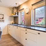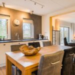 houtkachel en schuifpui naar zonneterras, half open keuken met inbouwapparatuur, via trap naar