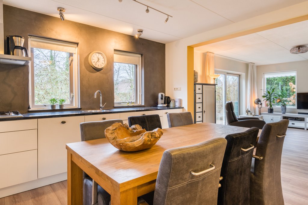 houtkachel en schuifpui naar zonneterras, half open keuken met inbouwapparatuur, via trap naar