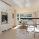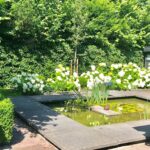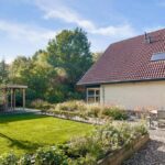De tuin heeft rondom zicht op groen en erg veel privacy: ‘zodra u de oprit opkomt bent u echt op uw eigen plek’. Aan het eind van de fotopresentatie ziet een paar zomerfoto’s.