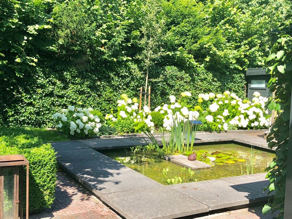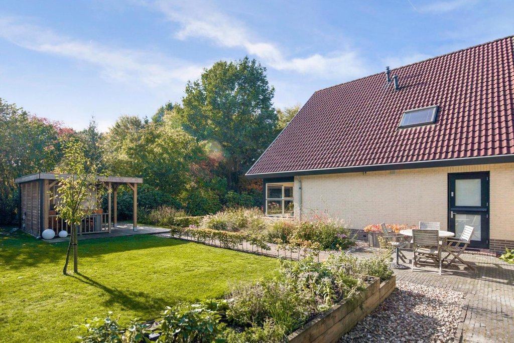 De tuin heeft rondom zicht op groen en erg veel privacy: ‘zodra u de oprit opkomt bent u echt op uw eigen plek’. Aan het eind van de fotopresentatie ziet een paar zomerfoto’s.