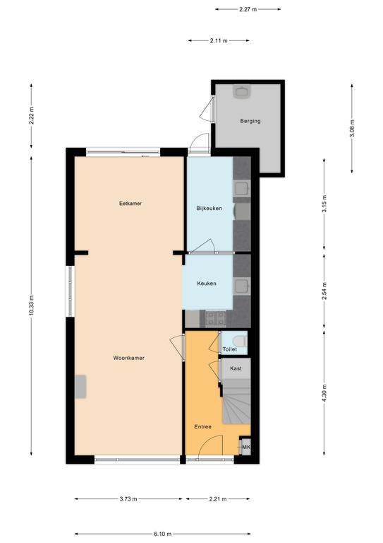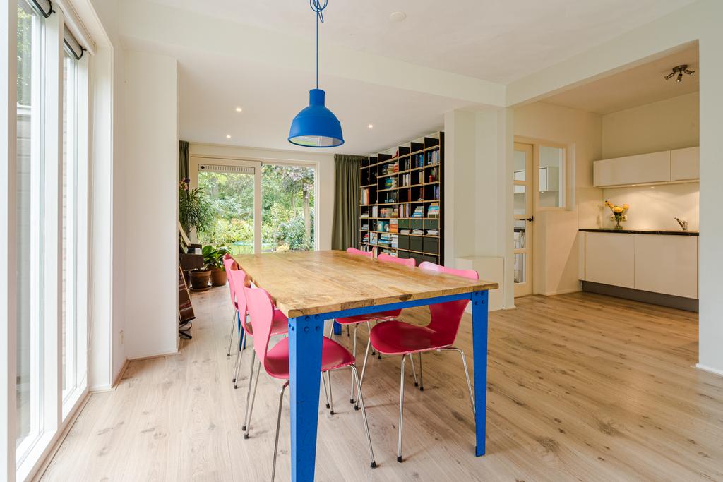 Entree, hal met toilet, woonkamer, half open keuken met inbouwapparatuur, uitbouw met schuifpui naar tuin, bijkeuken, fietsenberging/ hobbyruimte, vrijstaande garage met mooie diepe oprit voor meerdere auto’s.