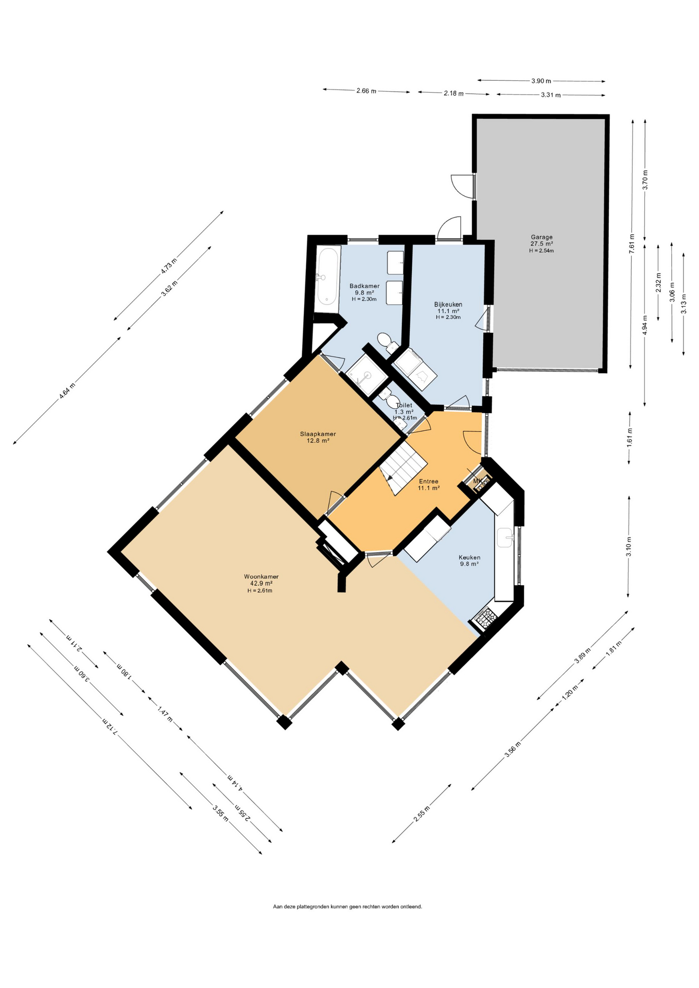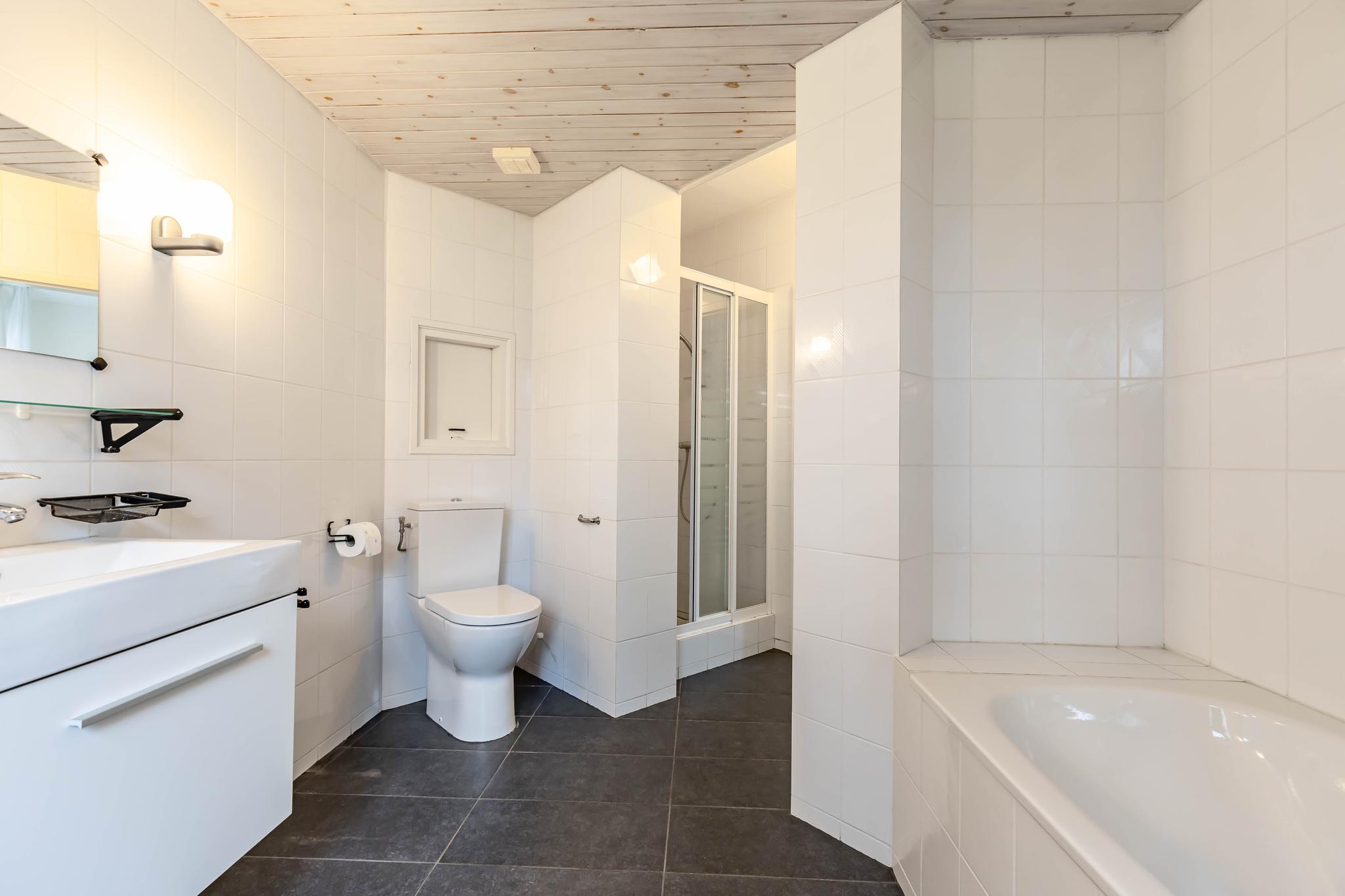 Terug in de gang vindt u een separaat toilet, de meterkast en de toegang tot de slaapkamer op de begane grond. Deze slaapkamer is rustig gelegen aan de achterzijde en biedt prachtig uitzicht op de tuin. Aangrenzend bevindt zich de royale badkamer, voorzien van een ligbad, een douche en een dubbele wastafel.
