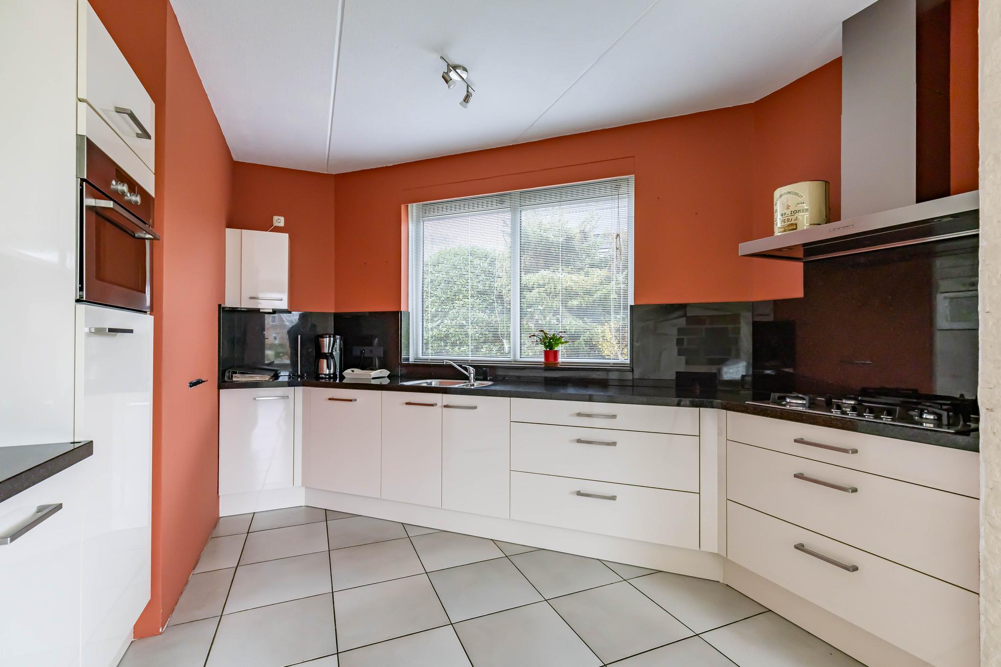 Een praktische bijkeuken, met aansluiting voor de wasmachine, biedt toegang tot de extra diepe garage.