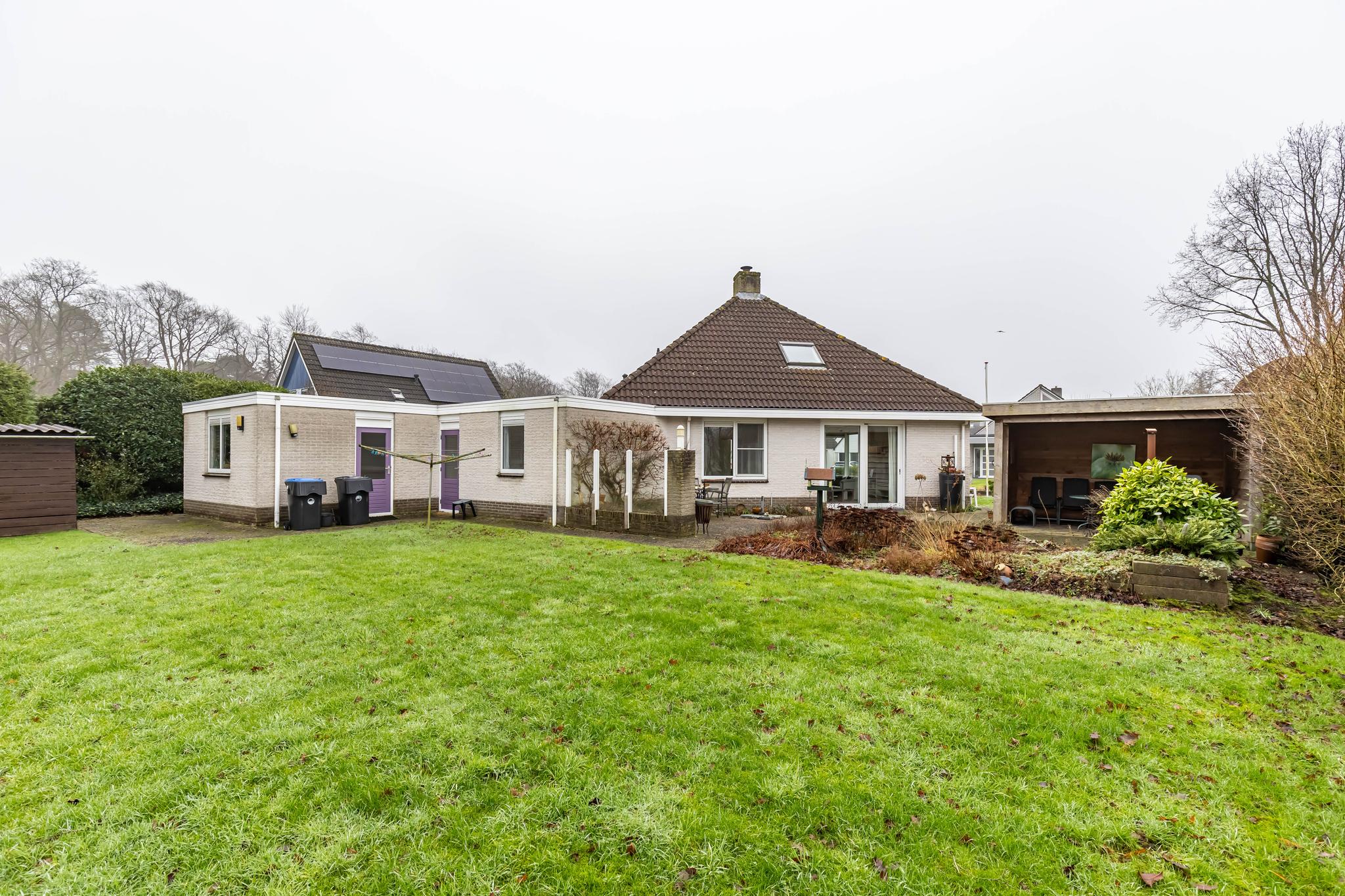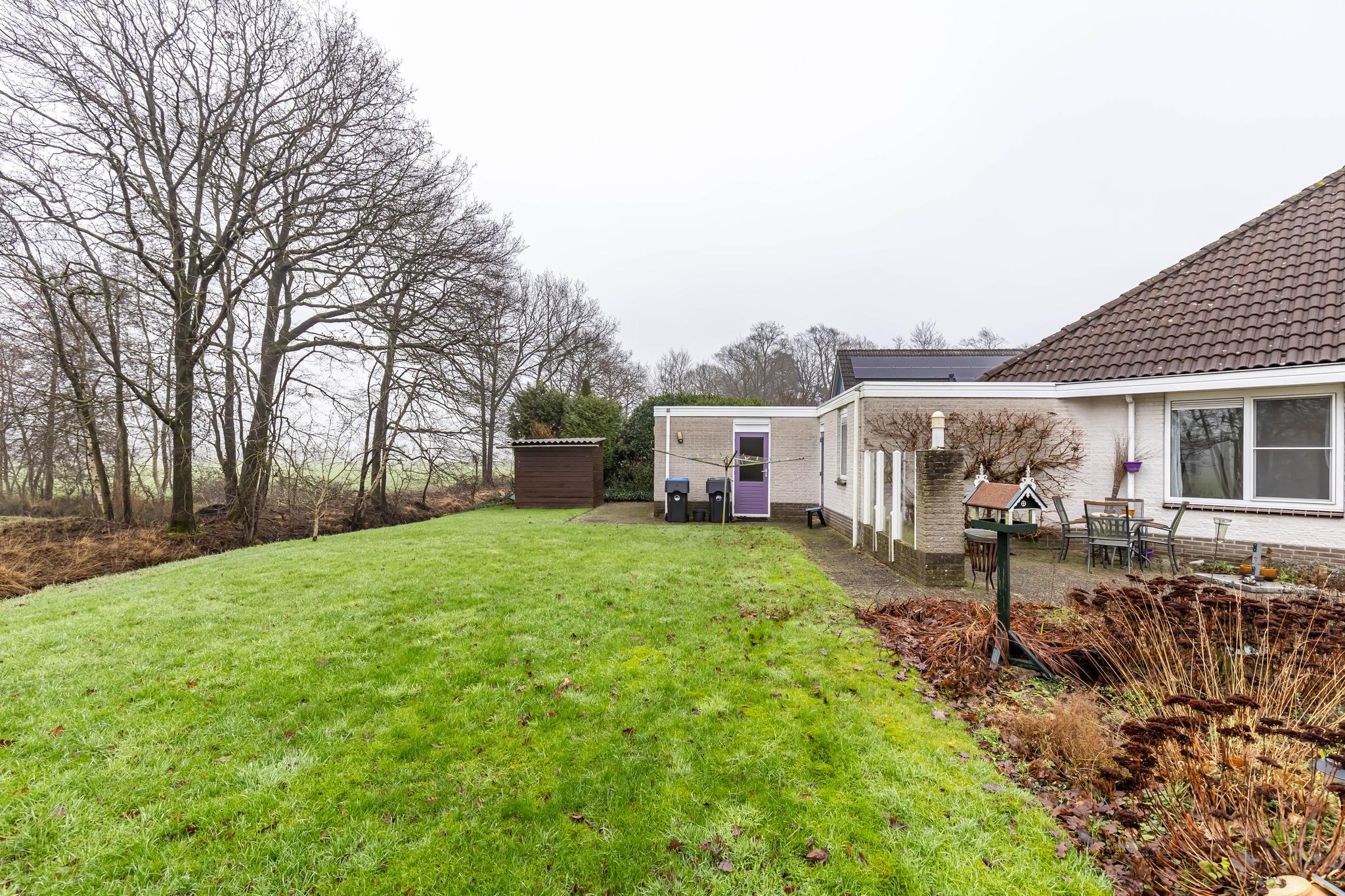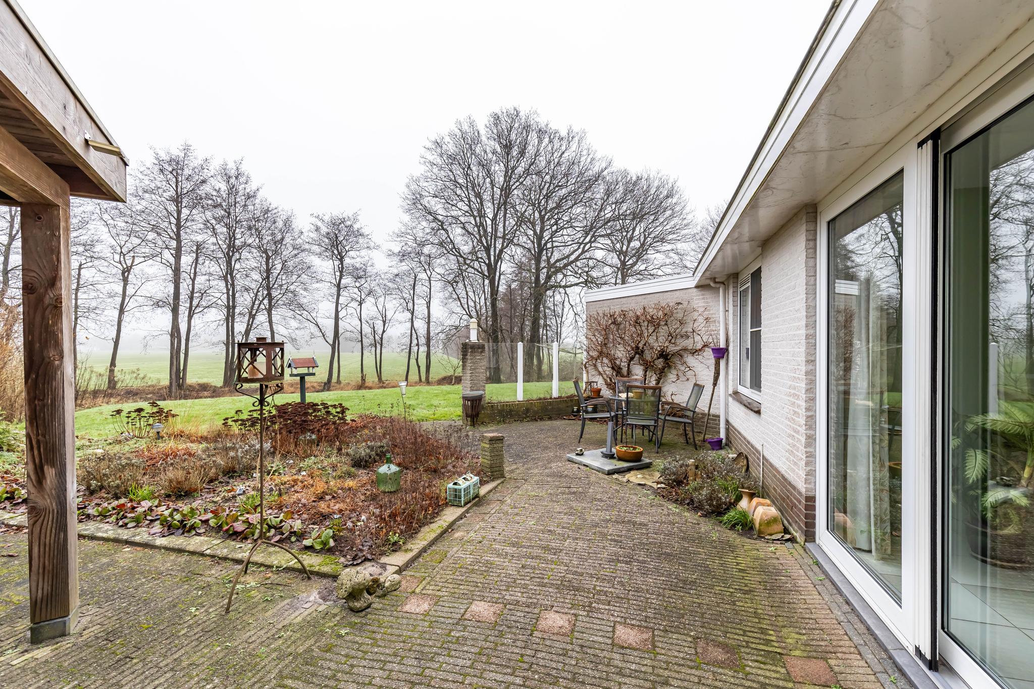 De tuin rondom de woning is een oase van rust, met diverse terrassen en een vrijstaande overkapping.